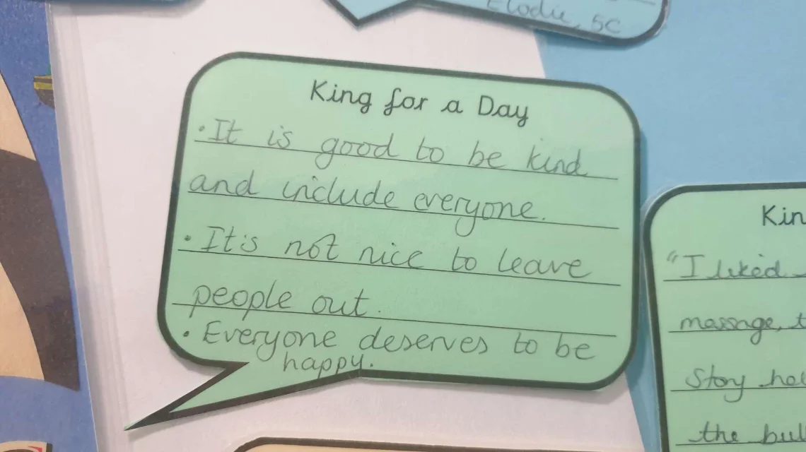 I have enjoyed learning about kindness, being kind helped me at breaktime…We have learned about being the same and being different…I love calm me time…If I have a sad feeling at home, I pretend there’s a chime bar and I close my eyes…When I do the breathing, it makes me feel calm…I know that grown ups at school help to keep us safe…In my class we help each other, we are kind, we share and we are friends…When we are safe and happy it means we can learn new things every day.