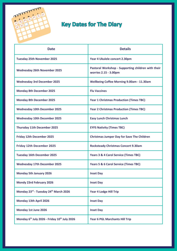 | Autumn term 2026 | Starts: Tuesday 1st September Half term: Monday 26th October to Friday 30th October Inset day: Ends: Friday 18th December |