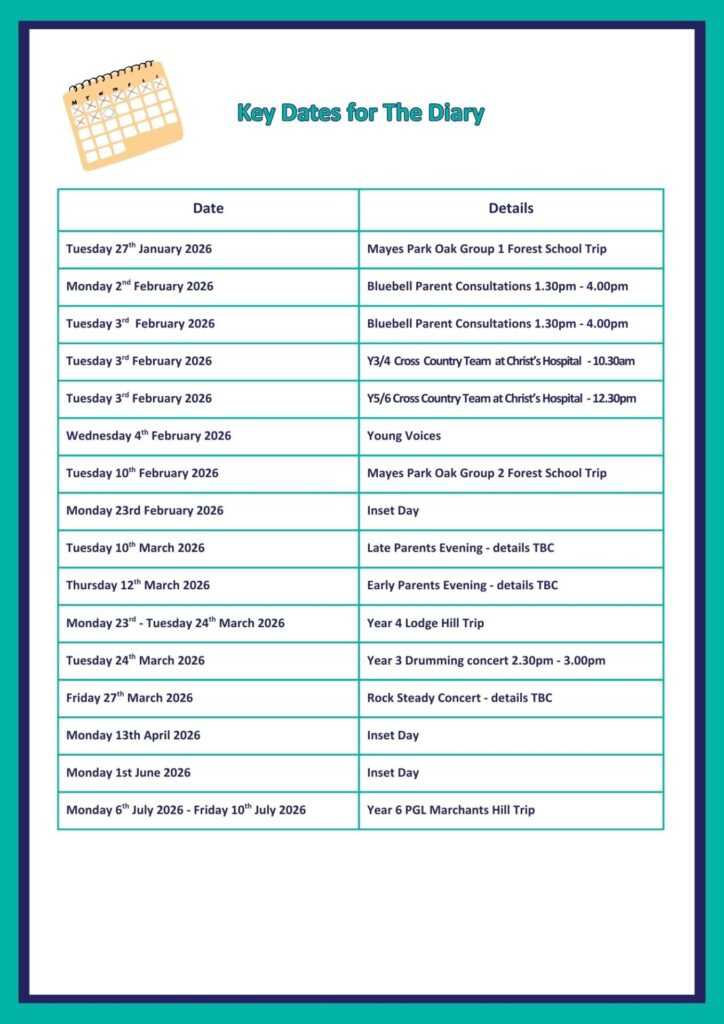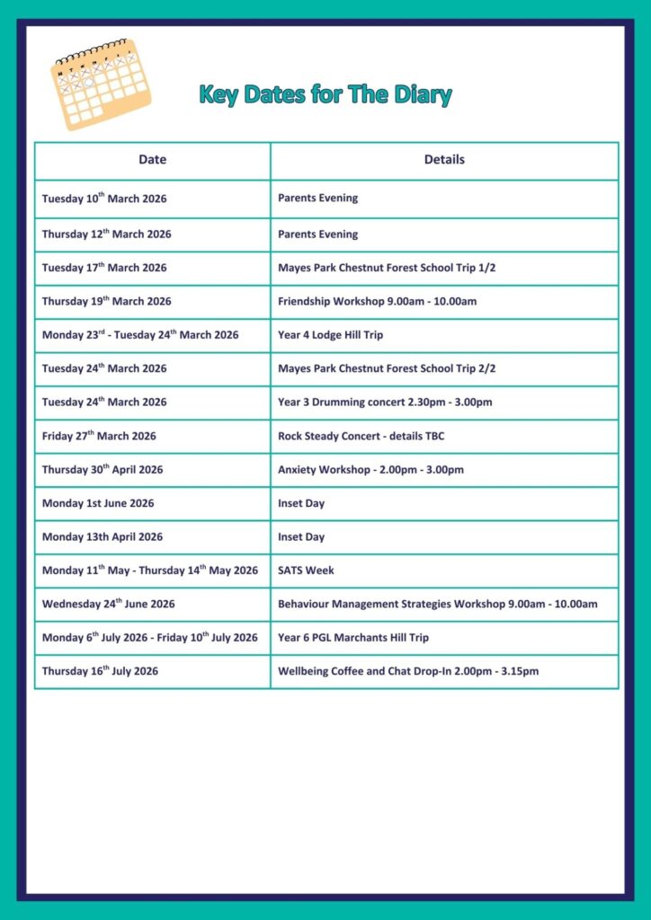 | Summer term 2026 | Starts: Monday 13th April Half term: Monday 25th May to Friday 29th May Inset day: Monday 13th April and Monday 1st June Ends: Wednesday 22nd July |